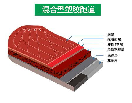 混合型聚氨酯跑道以化學(xué)原料在工廠(chǎng)制備甲乙兩組分, 現場(chǎng)使用時(shí),將兩組分混合,同時(shí)加入填料等,經(jīng)過(guò)鋪設、噴涂顆料等一系列工序而成。具有彈性好、防滑、耐磨等優(yōu)點(diǎn),且面層不容易脫粒。廣泛使用于國際、國內大中型田徑場(chǎng)。